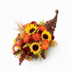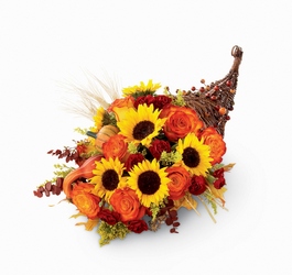 Cornucopia ushers in abundant beauty during the harvest season. This lovely horn-shaped basket is gorgeously adorned with sunflowers, bi-colored orange roses and burgundy carnations seated amongst eucalyptus and wheat to create the perfect centerpiece for your Thanksgiving feast.