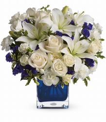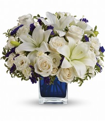Send someone a bit of heaven with this beautiful bouquet. Luxurious crème roses and pure white lilies paint a peaceful picture inside a sapphire blue cube. Approx. 12 1/2 W x 12 1/2 H