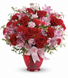 Spread the love! It's true bliss receiving a gift as lovely as this: gorgeous red roses and delicate pink alstroemeria, lovingly arranged in a keepsake Ginger jar. All tied up with a pretty pink bow, it's a surprise she'll adore now and forever! Approx. 13 1/2 W x 14 1/2 H