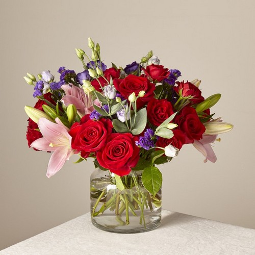This dreamy jewel toned bouquet combines bold color and eye catching texture to make a statement. Featuring a thoughtful array of both roses amd lilies, this dazzzling assortment is bound to impress your recipient.