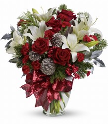 Take your holiday gift-giving to new heights with this dramatic bouquet! Classic red roses, snowy lilies and naturally festive berries and pine are gathered in a tall arrangement they'll long remember. Approx. 17 W x 19 H